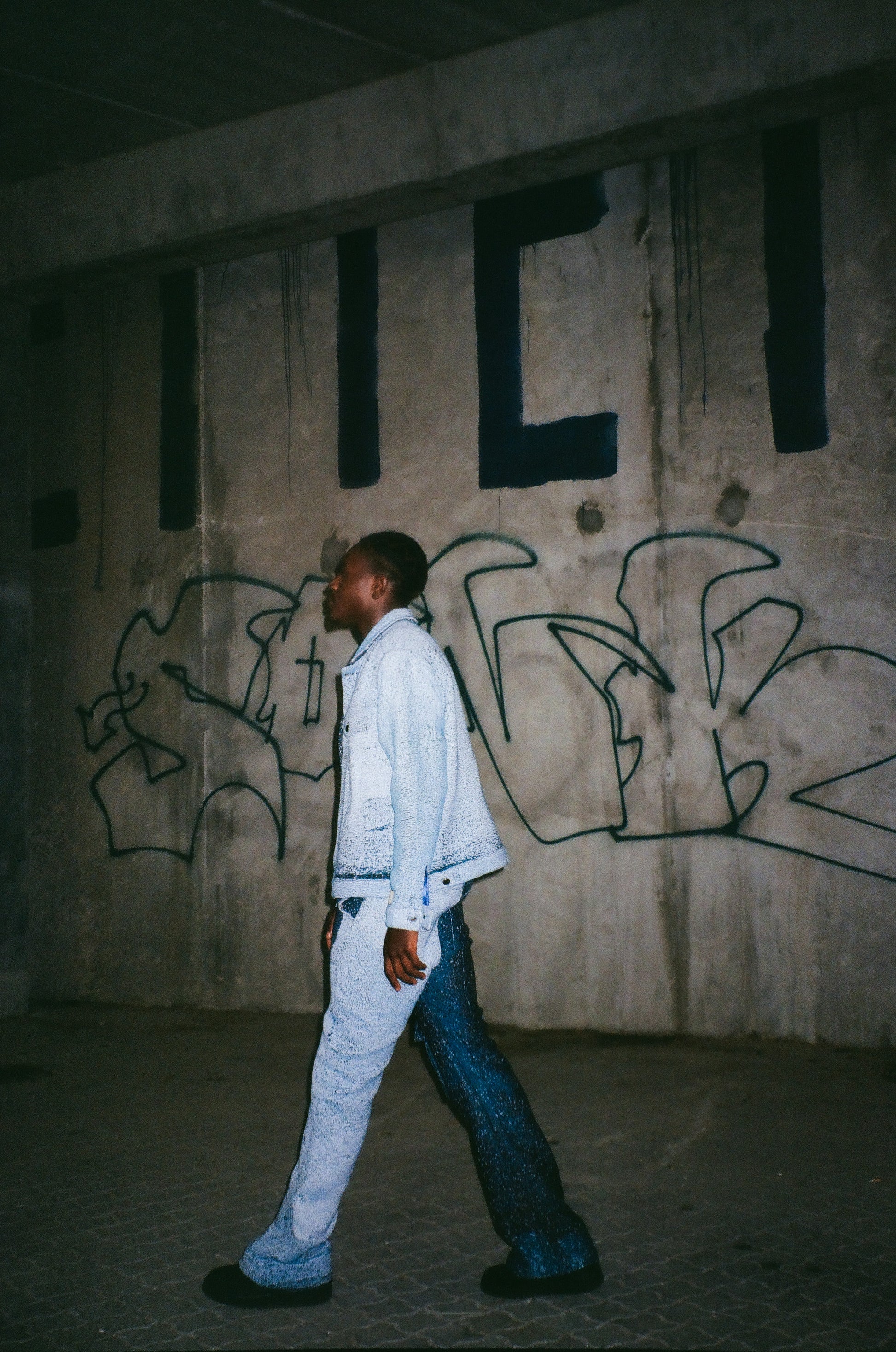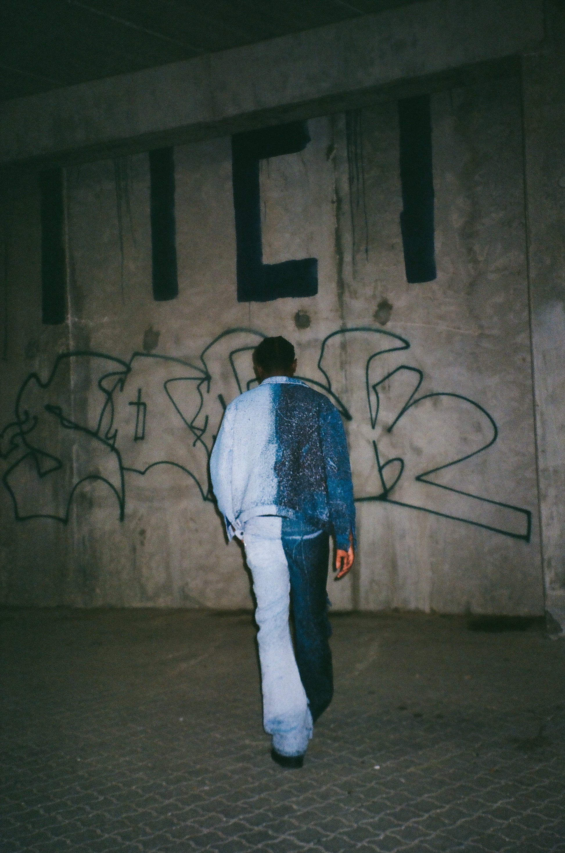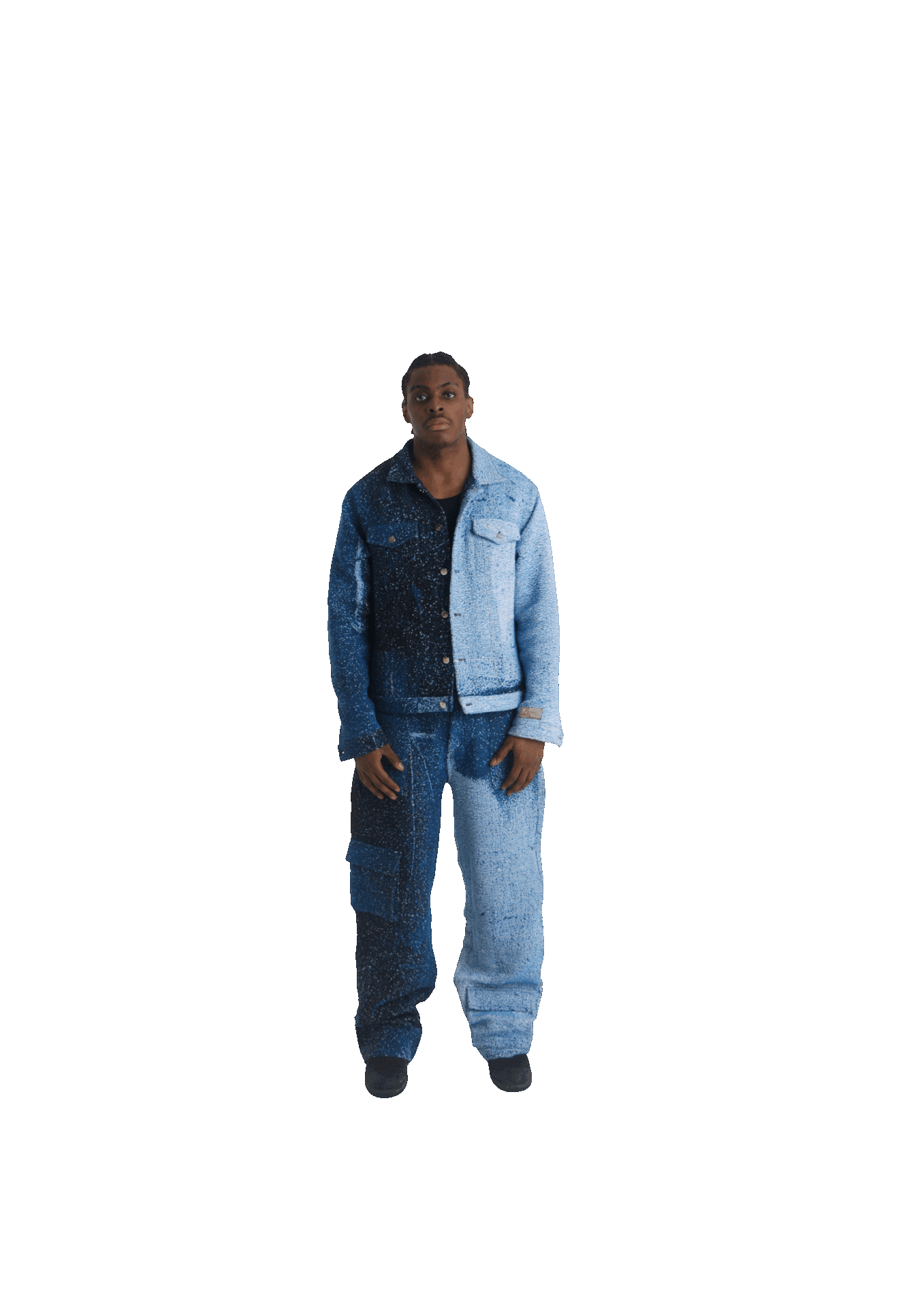 The [ 2BLUE ] set consist of a box-fitted jacket and baggy straight legged trousers . The pieces are crafted in a heavy, tight knitted and high quality tapestry . The jacket is crafted like a denim jacket and cut to a box-fit . The trousers have a straight fit from top to bottom, and goes over the shoe . There are 6 pockets in total ; two side-pockets, one on the right thigh, one on the bottom leg, and two over-layered pockets on the left back, with a signature metal logo plate . Labels are to be located on the bottom left sleeve, back shoulder, right side on the belt territory, as well as inside both the jacket and trousers . There are no irritation, allergic reactions or any kind of discomfort with the fabric .