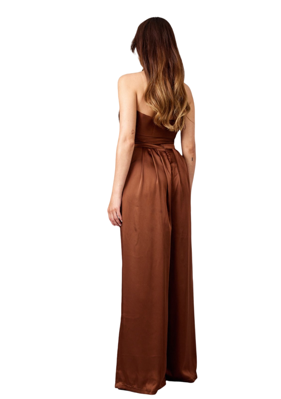 the marron set is crafted by luminous luxe satin . the trousers waistband are wide and placed over the hips . the waistband is designed to hug the waist to enhance your curves . the trousers are super wide and wide fitted from the crotch down . the zipper is placed on the center back . the satin scarf top is a long rectangular scarf . the marron scarf top is double layered and crafted by luminous luxe satin . the scarf is one long rectangular piece that gives you multiple options to tie it how you desire . the fabric is gentle against the skin : no irritation, allergic reactions or any kind of discompfort with the fabric .
