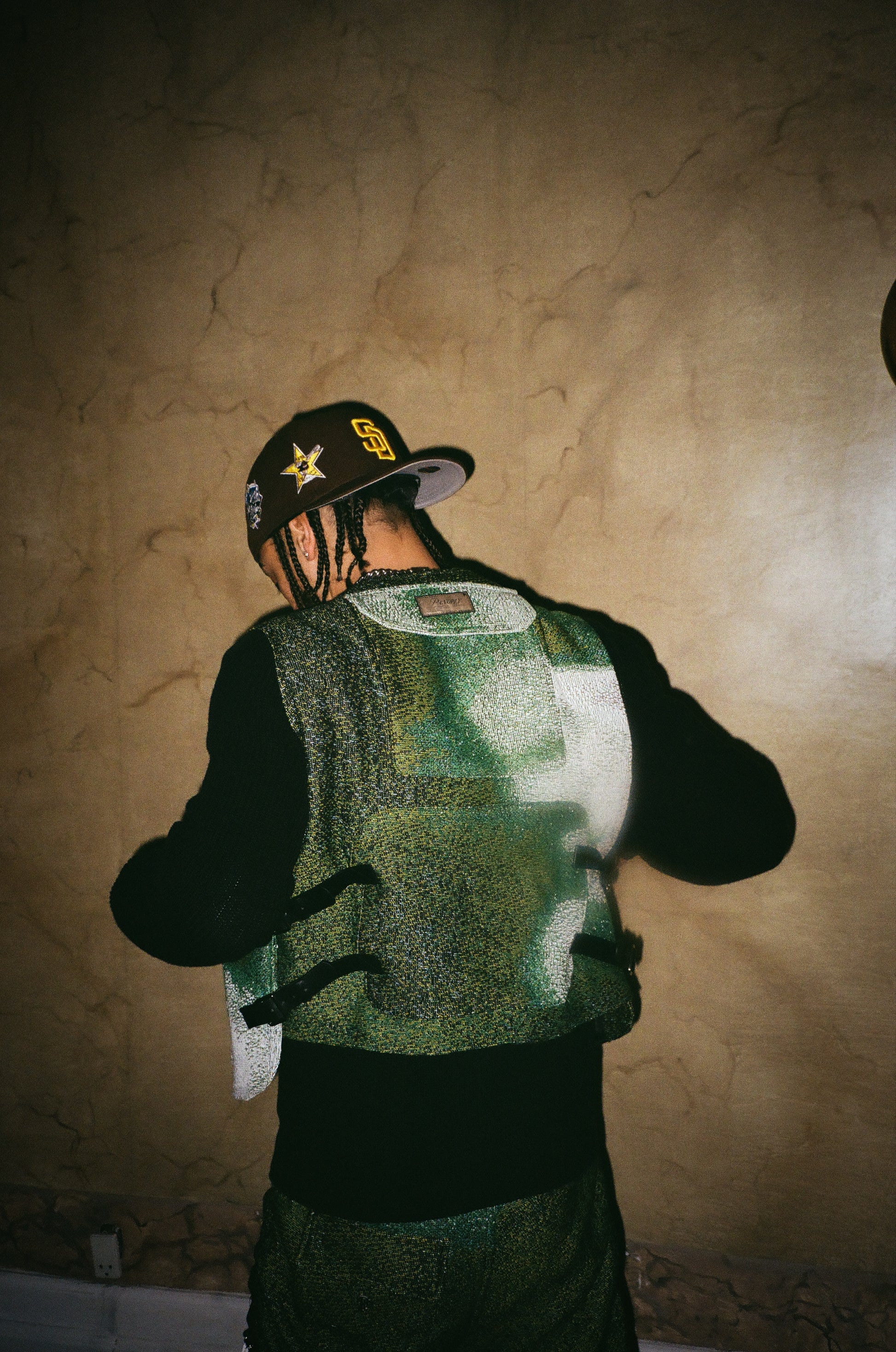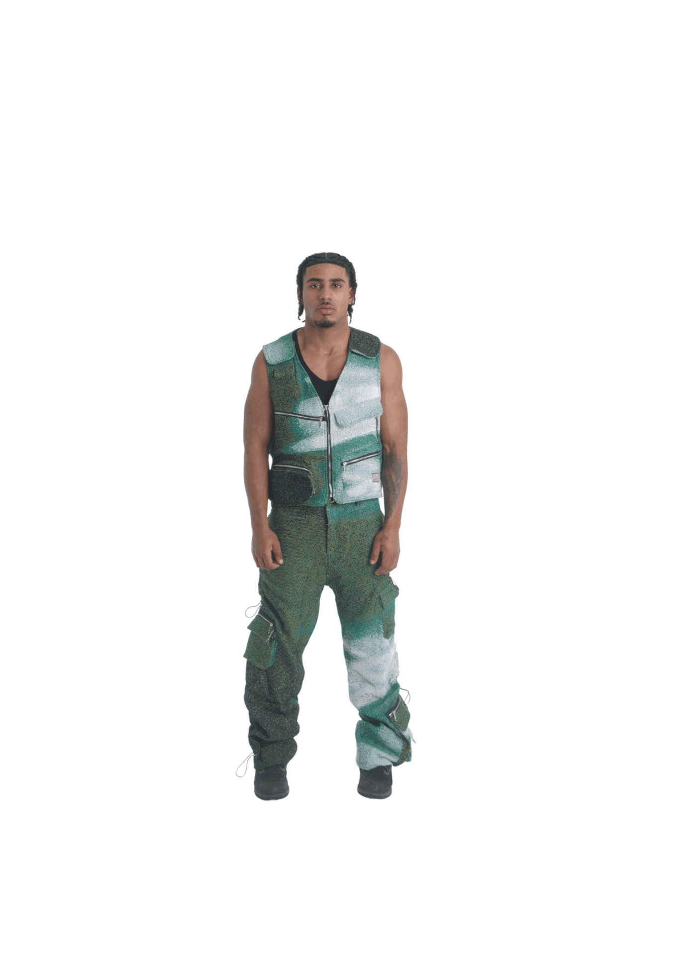 The [ GREEN FUSION ] set consist of a box-fitted vest, with adjustable leather straps and velcro on each side, and baggy multi ruched baggy fitted trousers . The pieces are crafted in a heavy, tight knitted and high quality tapestry . The vest is crafted with endless details . Not only are we looking at a vest with multiple pockets on the fronts, but also a large pocket on the center back of the vest . The vests are adjustable in two different areas, which gives you the opportunity to regulate the fit of the vest as you desire . Labels are located on the left bottom pocket and on the flap of the pocket on the upper back . The interior of the vest are lined with matte satin .