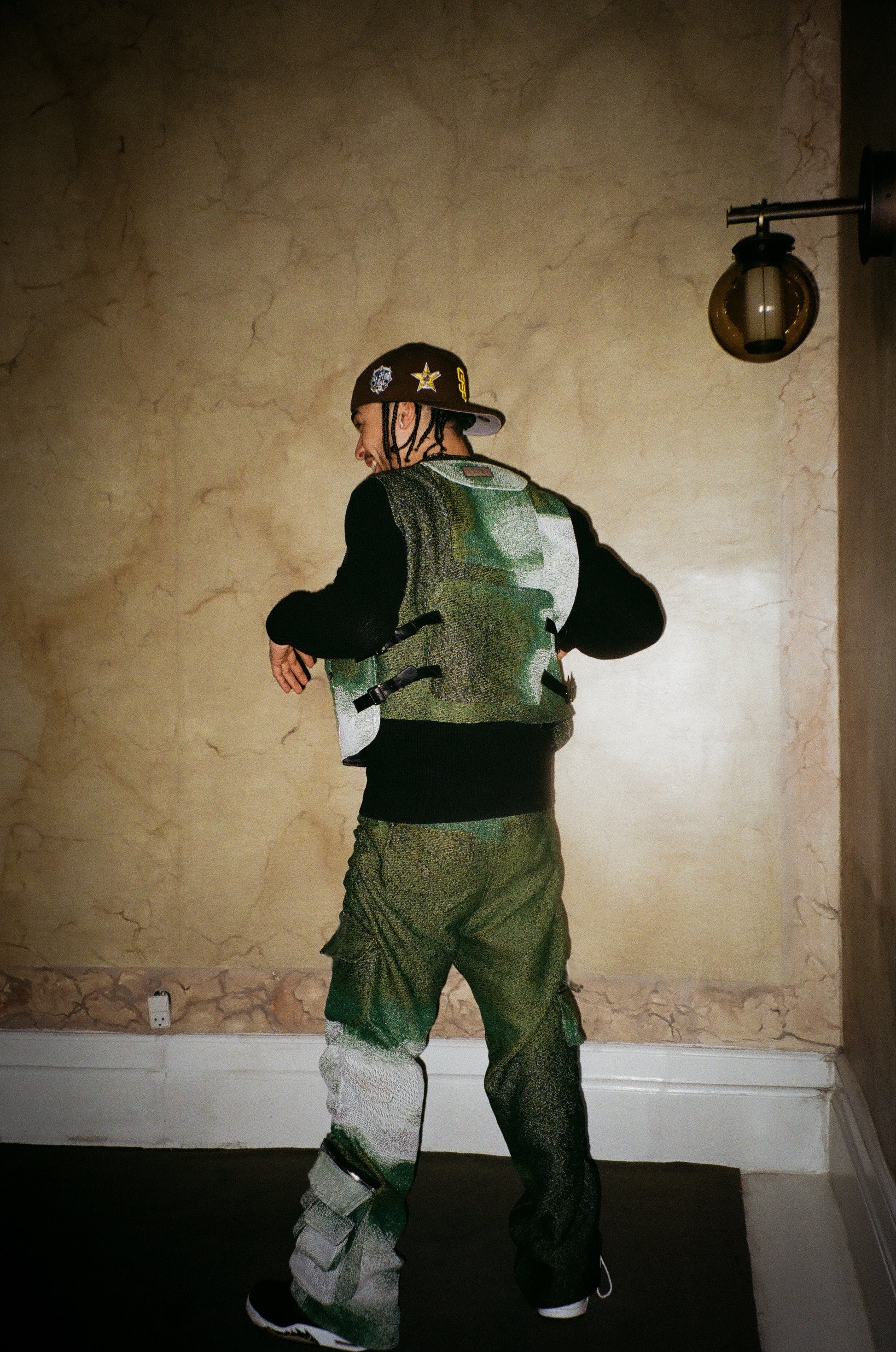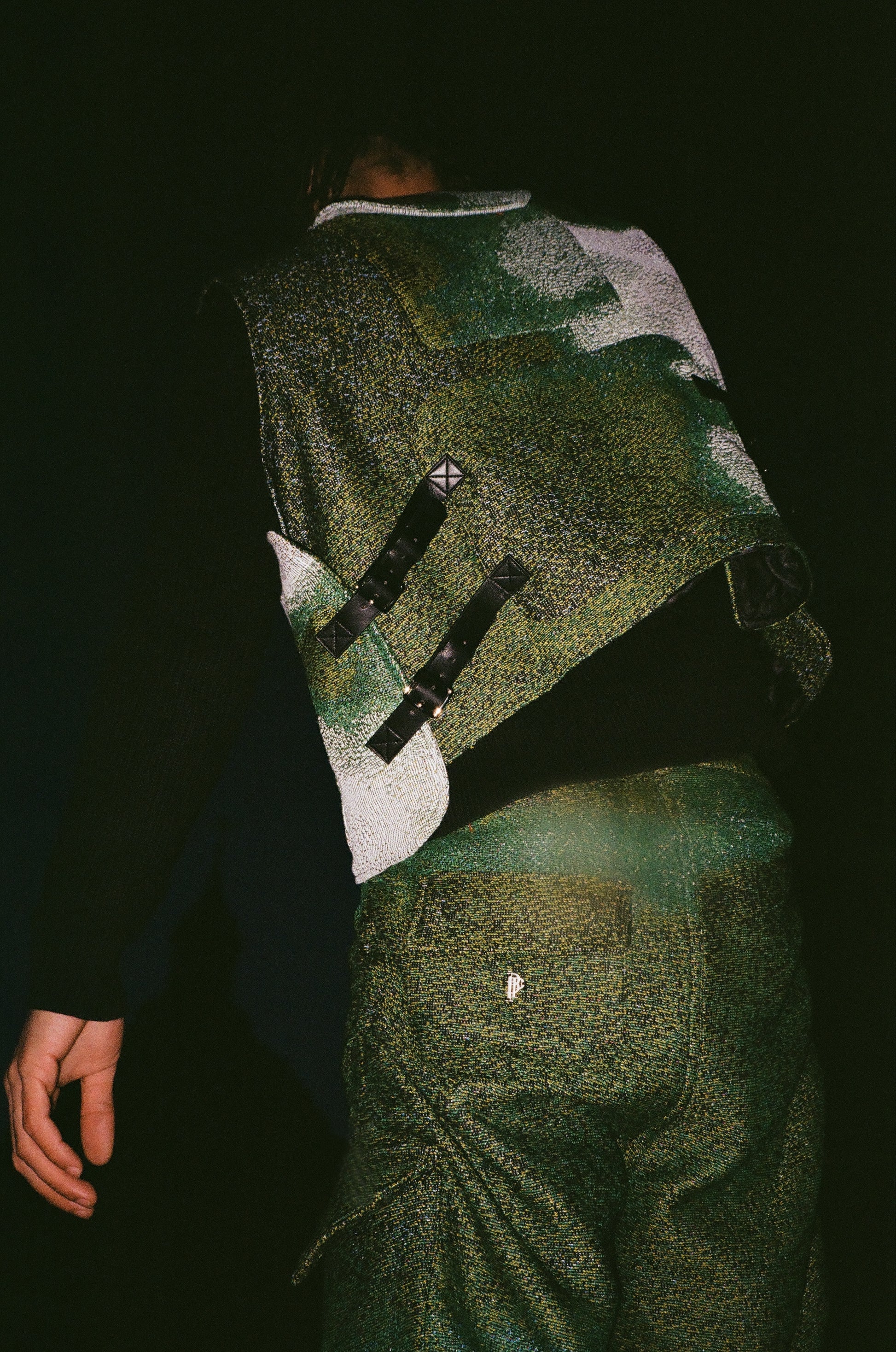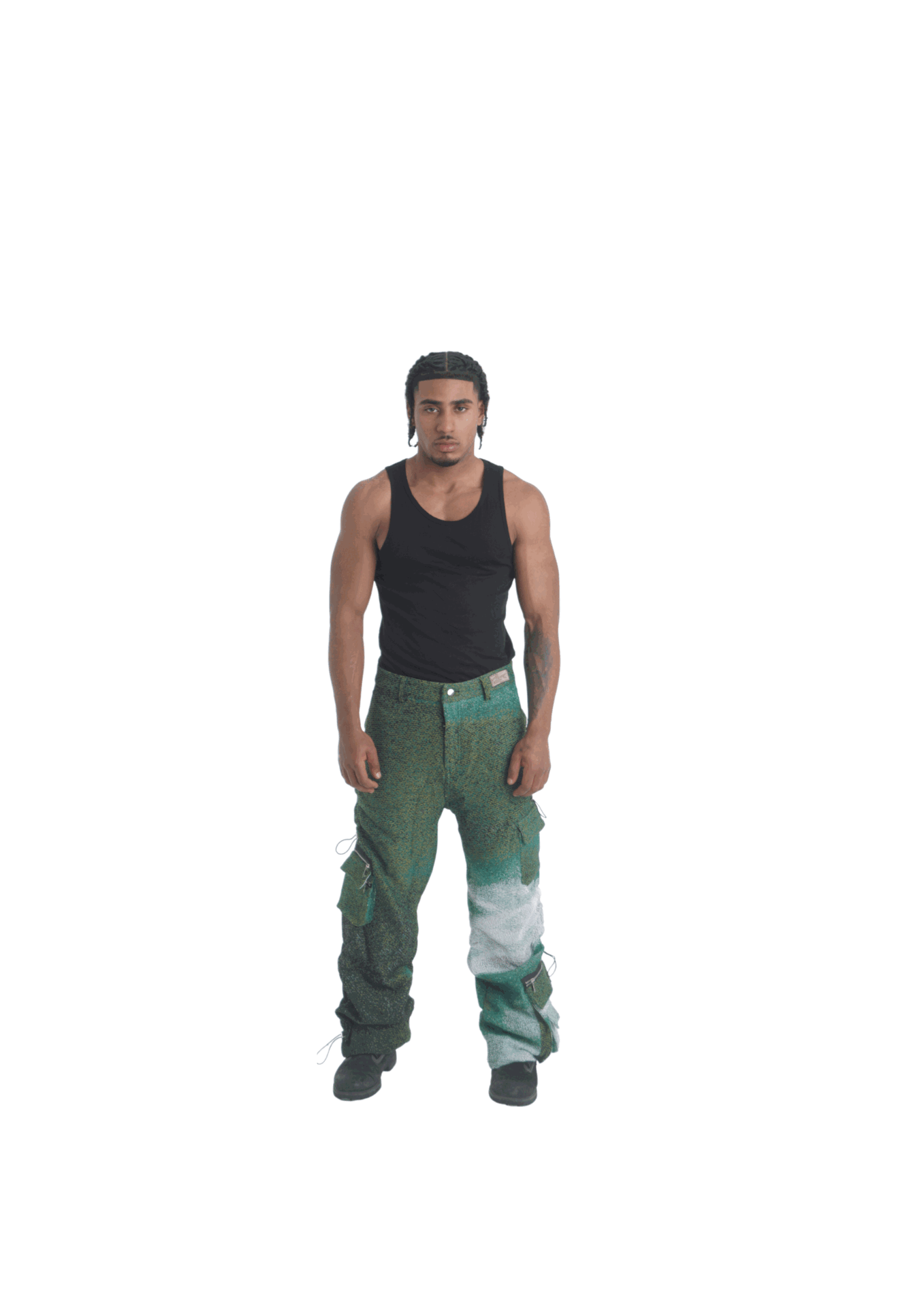 The [ GREEN FUSION ] set consist of a box-fitted vest, with adjustable leather straps and velcro on each side, baggy multi ruched baggy fitted trousers and loose fitted shorts . The pieces are crafted in a heavy, tight knitted and high quality tapestry . The trousers are crafted with endless details as well as the shorts and vest . Not only are we looking at a pair of trousers with different pocket placements and each different designs, but also a ruche effect running through each leg, that gives you the opportunity to regulate the fit and look of the shorts as you desire . Labels are located on the left belt waist our silver signature logo pendant on the back pocket .