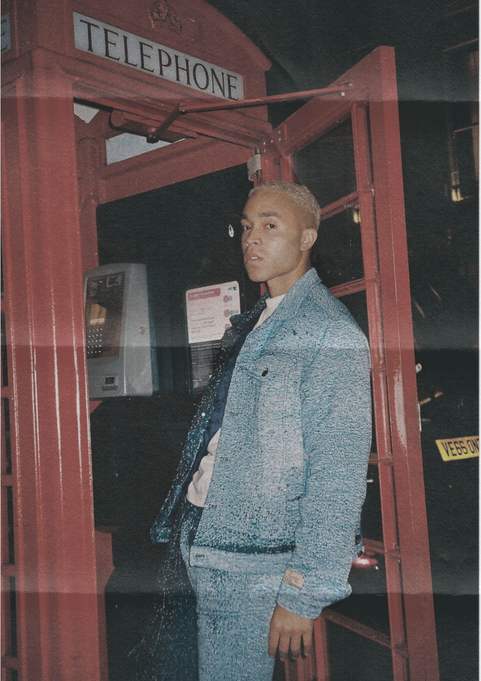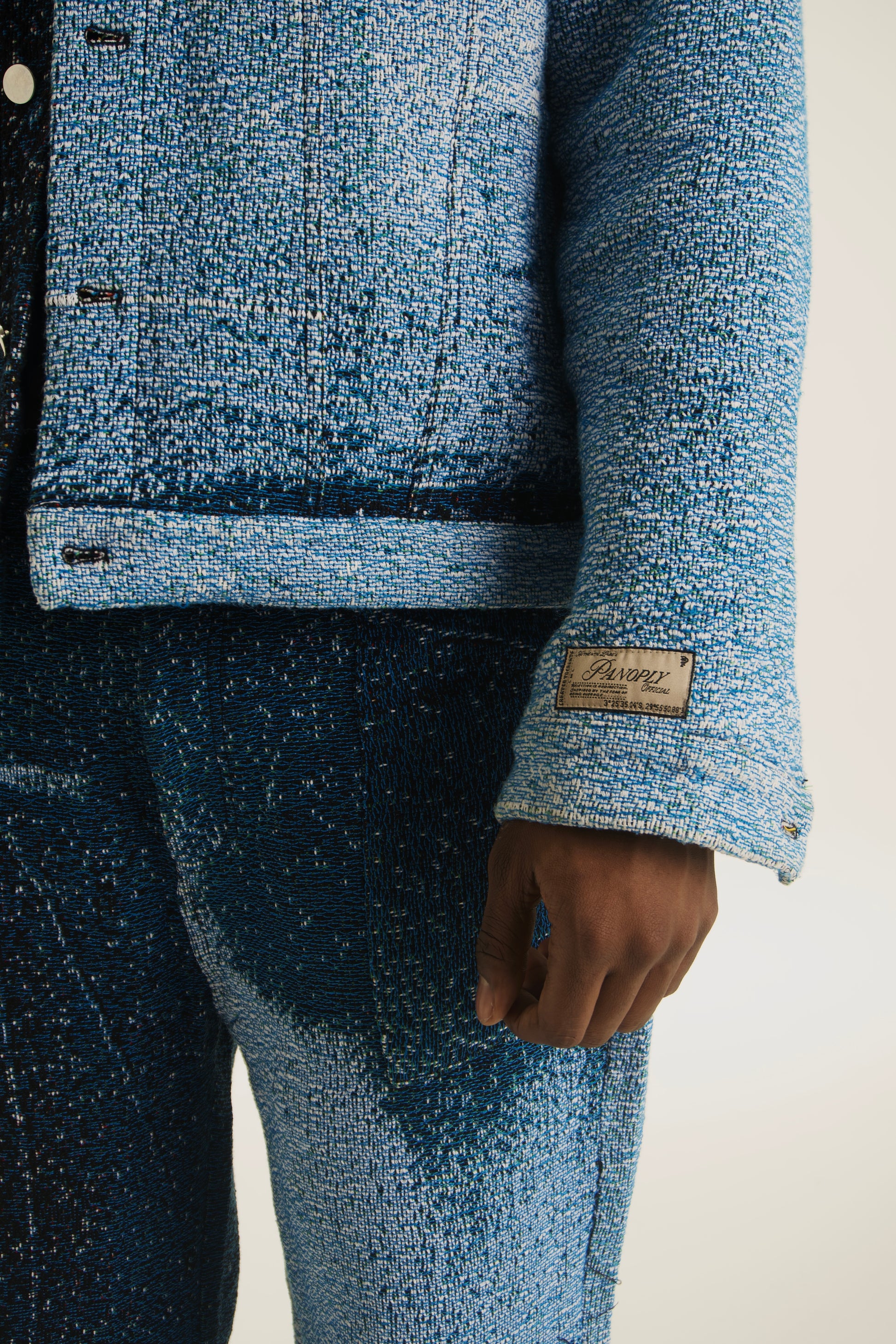 The [ 2BLUE ] set consist of a box-fitted jacket and baggy straight legged trousers . The pieces are crafted in a heavy, tight knitted and high quality tapestry . The jacket is crafted like a denim jacket and cut to a box-fit . The jacket Labels are to be located on the bottom left sleeve, back shoulder, right side on the belt territory, as well as inside both the jacket and trousers . There are no irritation, allergic reactions or any kind of discomfort with the fabric .