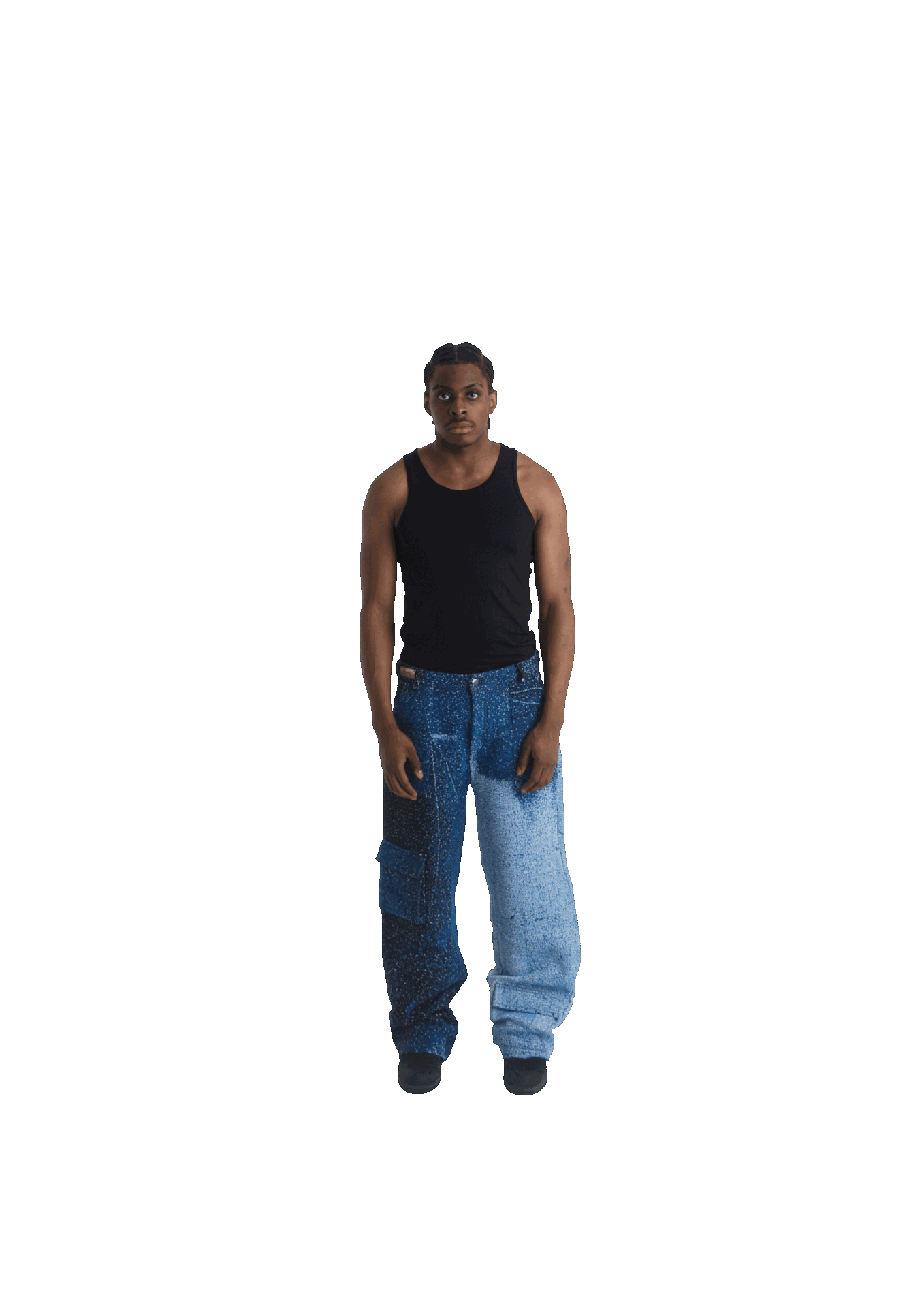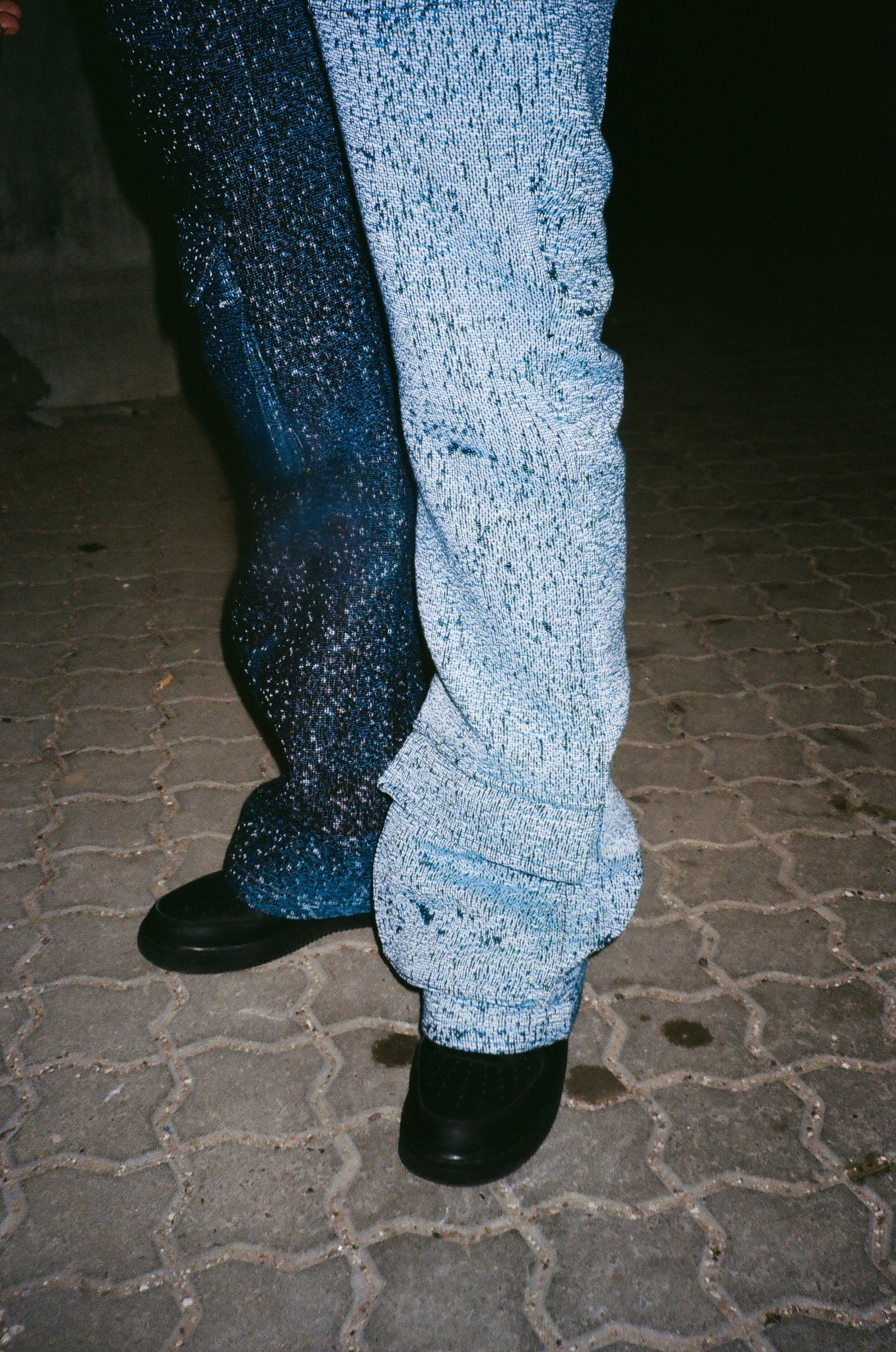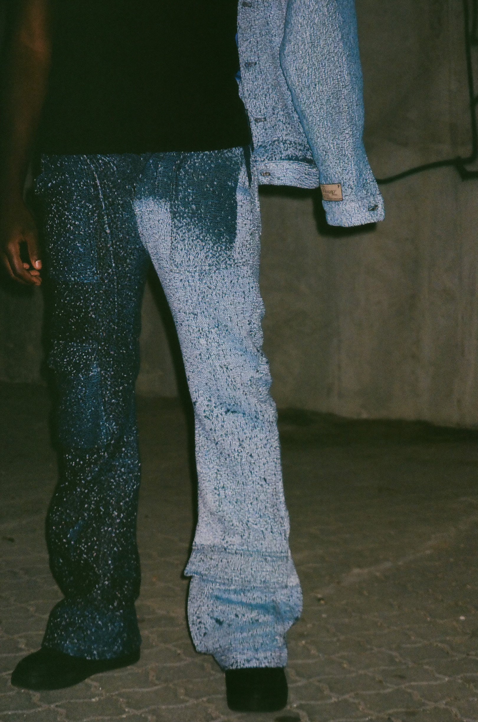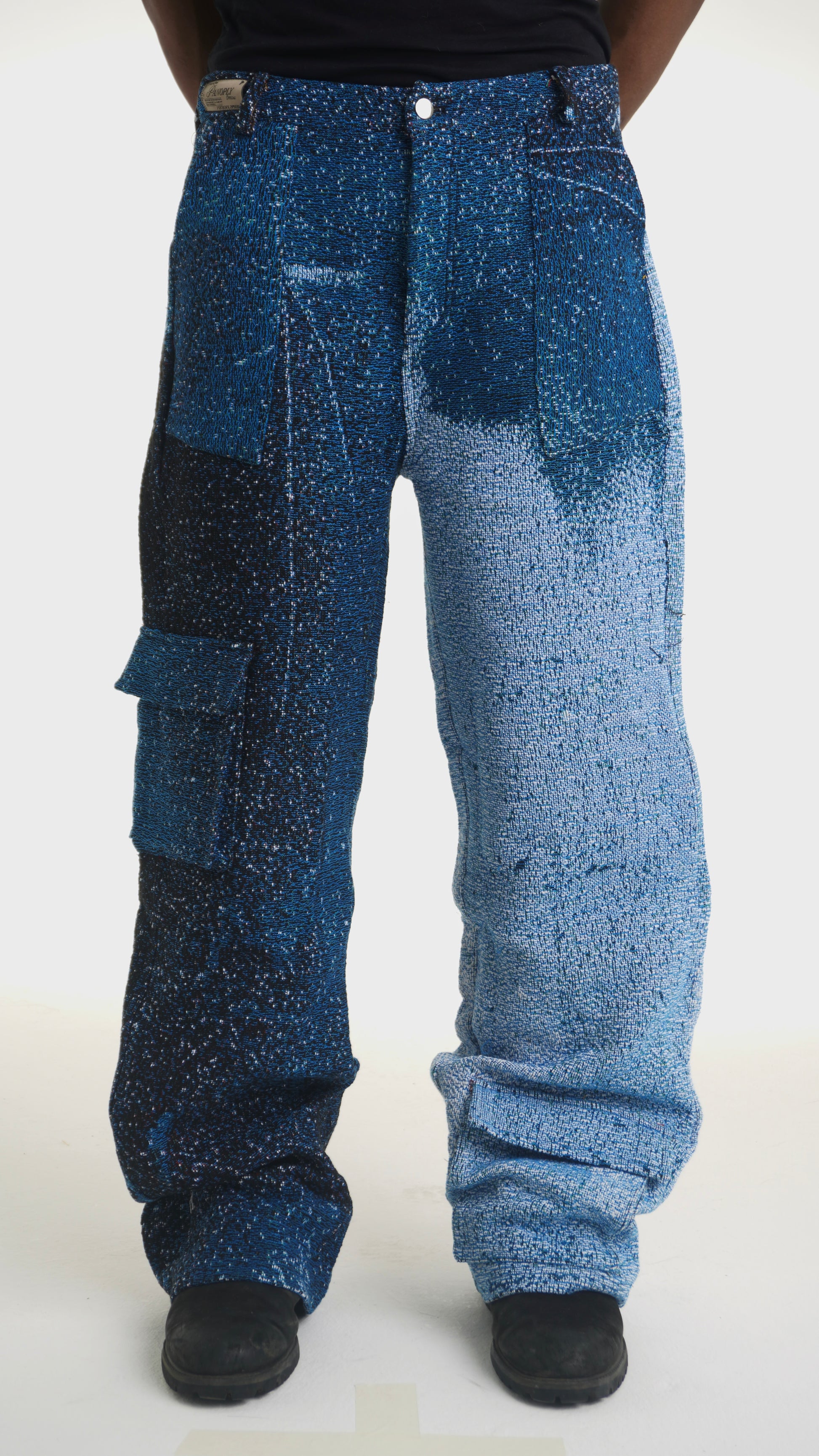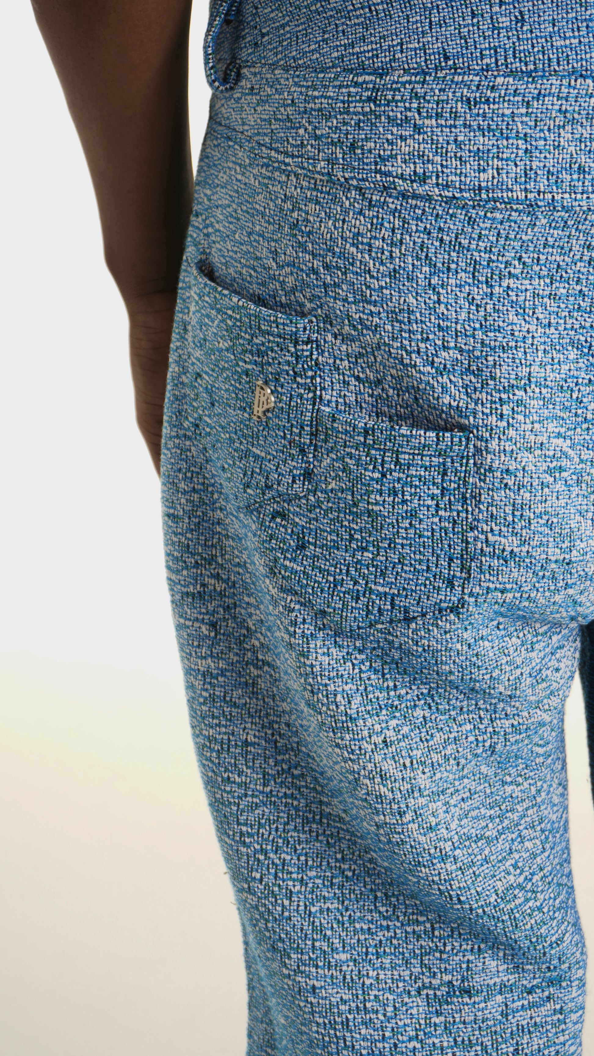 The [ 2BLUE ] set consist of a box-fitted jacket and baggy straight legged trousers . The pieces are crafted in a heavy, tight knitted and high quality tapestry . The trousers have a straight fit from top to bottom, and goes over the shoe . There are 6 pockets in total ; two side-pockets, one on the right thigh, one on the bottom leg, and two over-layered pockets on the left back, with a signature metal logo plate . The trousers are styled with a matching jacket . Labels are to be located on the bottom left sleeve, back shoulder, right side on the belt territory, as well as inside both the jacket and trousers . There are no irritation, allergic reactions or any kind of discomfort with the fabric .