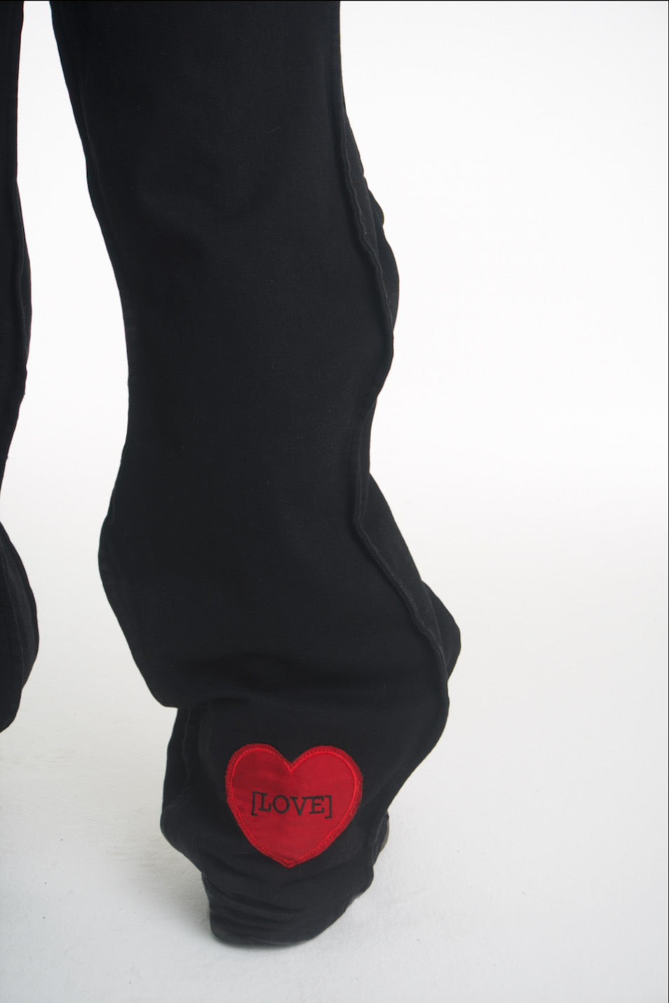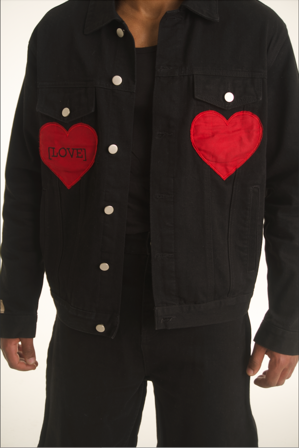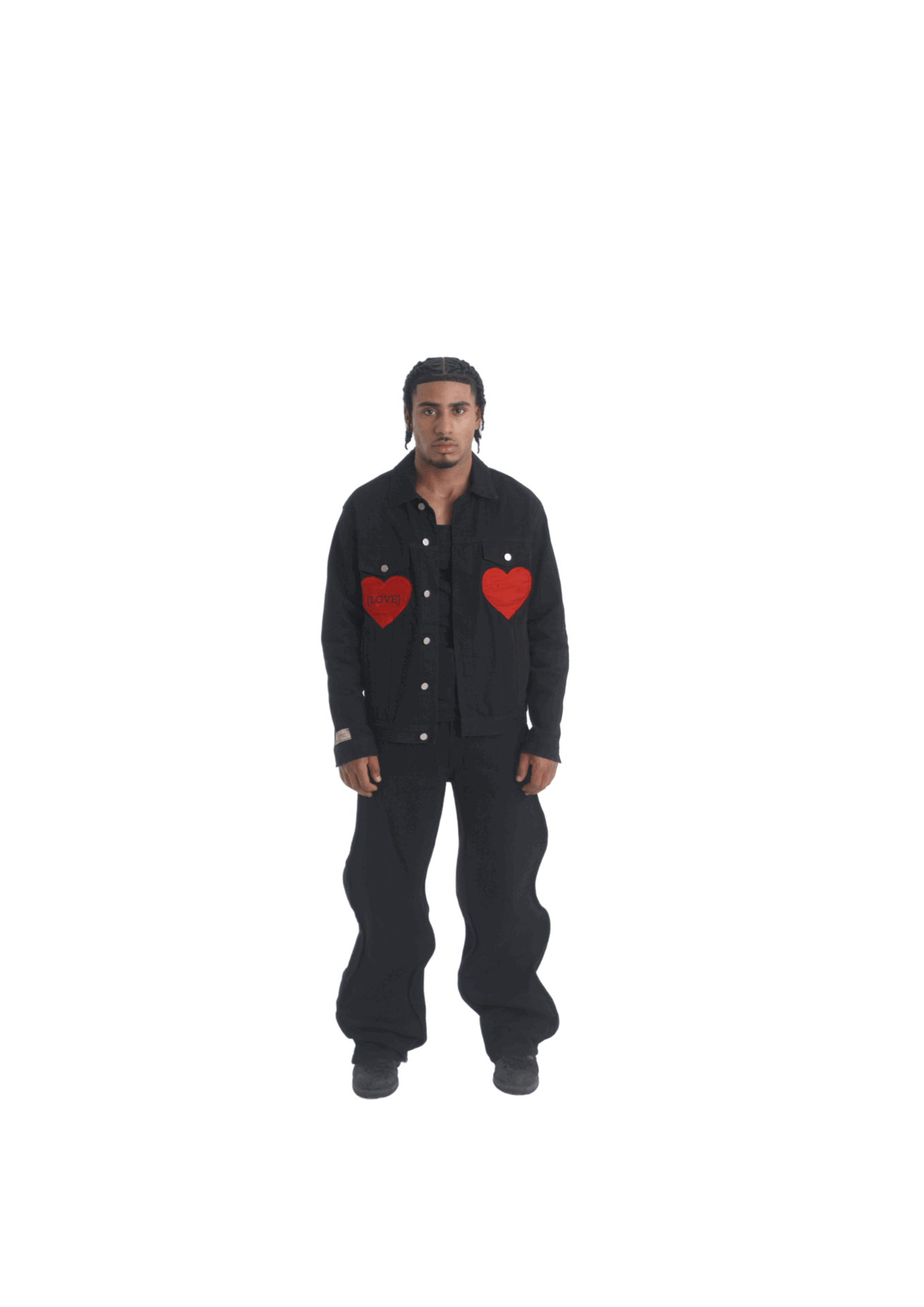 The [ LOVE TEARS ] set consist of a box-fitted jacket and baggy wavy cut jeans. The pieces are crafted in a heavy weight jet-black denim . The jacket is cut to a traditional denim jacket look, while having two hearts across the chests; one on each side, with [ LOVE ] embroidered inside the left heart . While the jeans have a wavy cut illusion, they also have hearts over-layered on the bottom back of the trousers, with panoply embroidered in cursive. Furthermore, a heart located on the back bottom right leg, with [ LOVE ] embroidered within. Labels are to be located on the bottom right sleeve, back shoulder, right side on the belt territory, as well as inside both the jacket and trousers . There are no irritation, allergic reactions or any kind of discomfort with the fabric .
