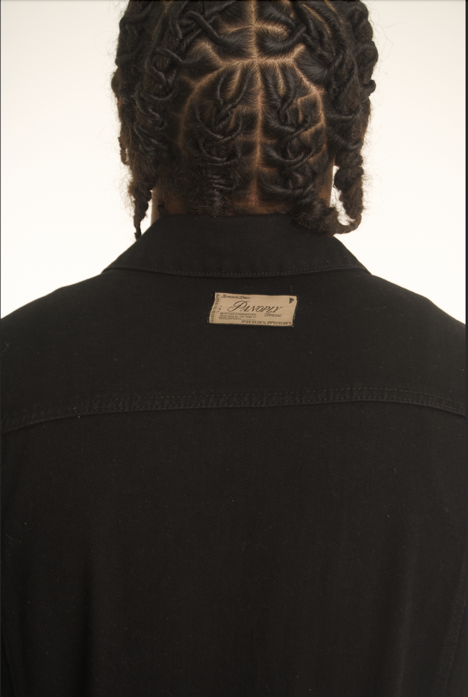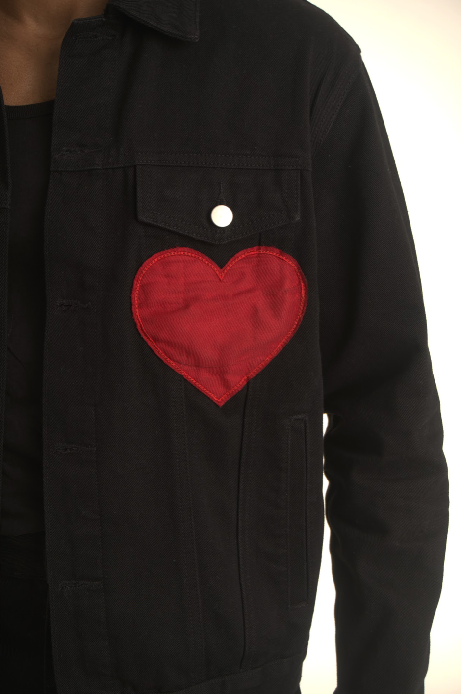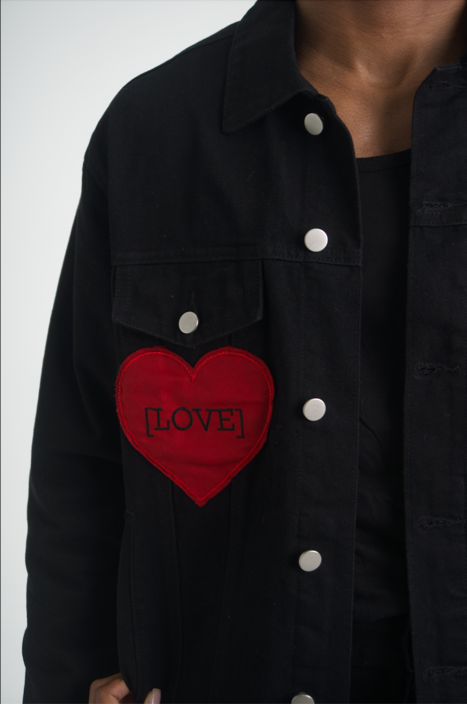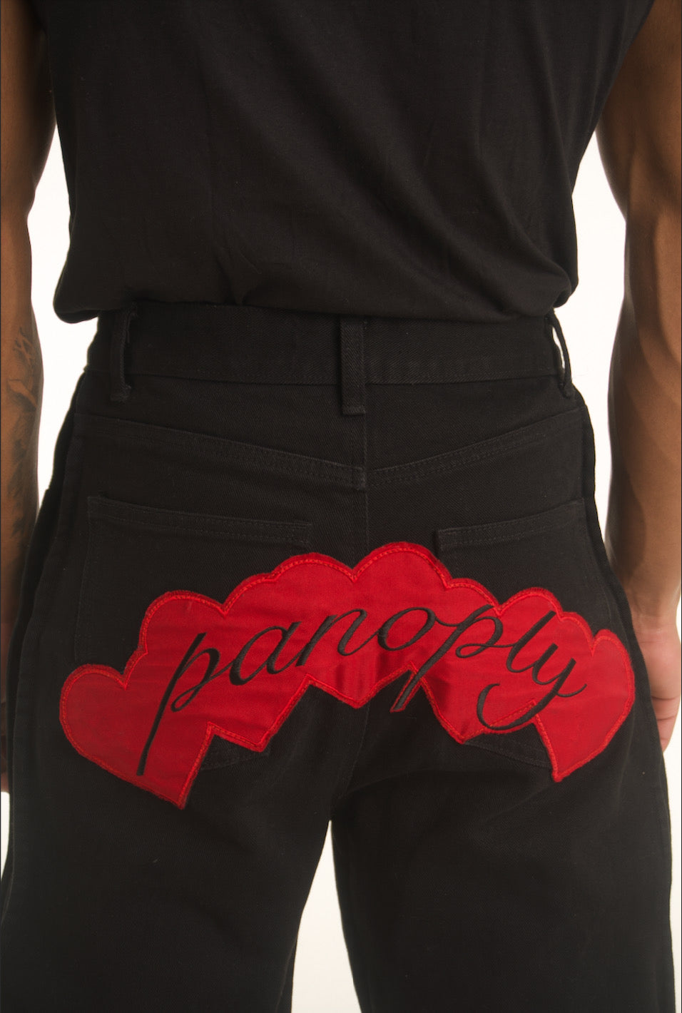The [ LOVE TEARS ] set consist of a box-fitted jacket and baggy wavy cut jeans. The pieces are crafted in a heavy weight jet-black denim . The jacket is cut to a traditional denim jacket look, while having two hearts across the chests; one on each side, with [ LOVE ] embroidered inside the left heart . While the jeans have a wavy cut illusion, they also have hearts over-layered on the bottom back of the trousers, with panoply embroidered in cursive. Furthermore, a heart located on the back bottom right leg, with [ LOVE ] embroidered within. Labels are to be located on the bottom right sleeve, back shoulder, right side on the belt territory, as well as inside both the jacket and trousers . There are no irritation, allergic reactions or any kind of discomfort with the fabric .