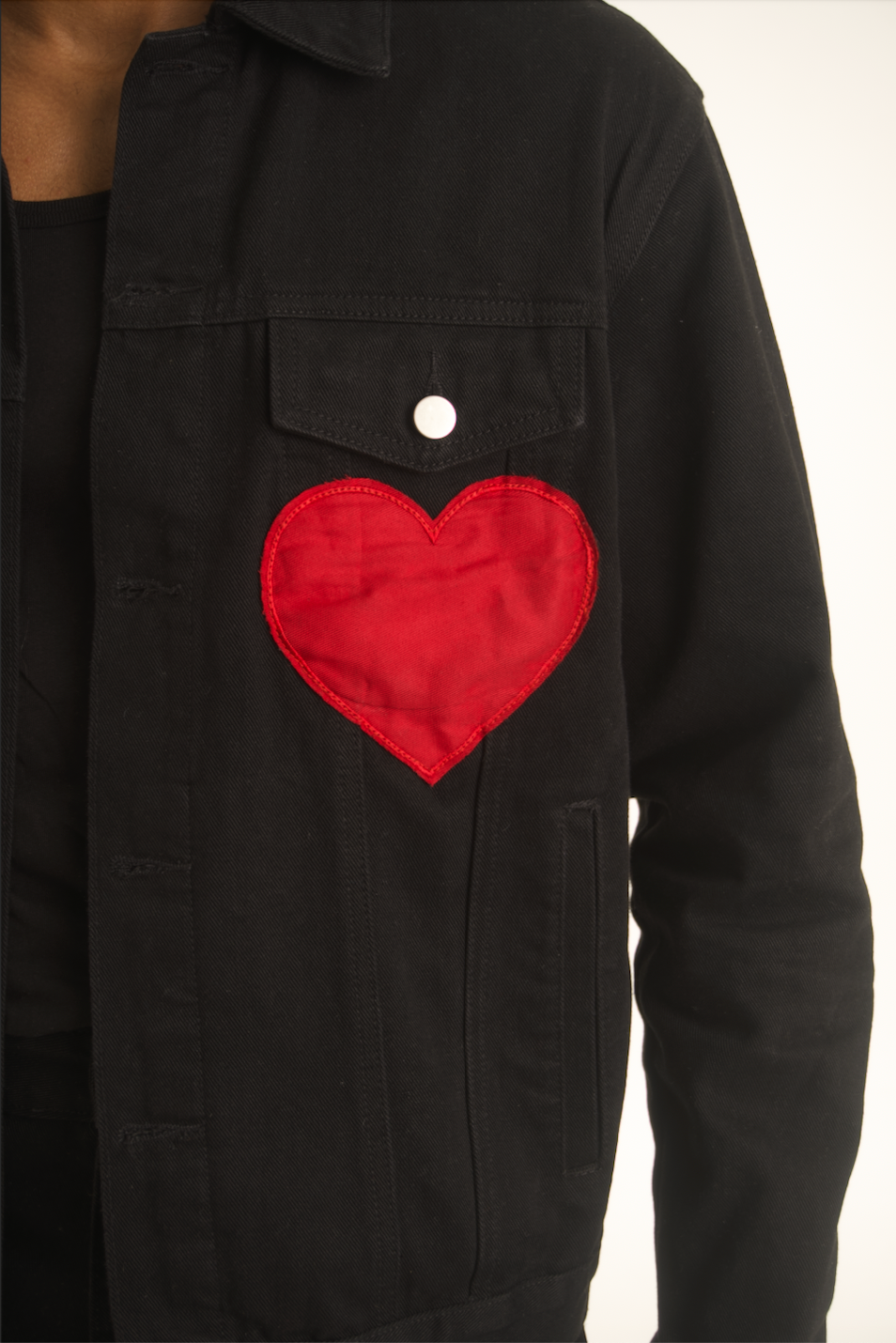 The [ LOVE TEARS ] set consist of a box-fitted jacket and baggy wavy cut jeans. The pieces are crafted in a heavy weight jet-black denim . The jacket is cut to a traditional denim jacket look, while having two hearts across the chests; one on each side, with [ LOVE ] embroidered inside the left heart . Labels are to be located on the bottom right sleeve, back shoulder, right side on the belt territory, as well as inside both the jacket and trousers . There are no irritation, allergic reactions or any kind of discomfort with the fabric .