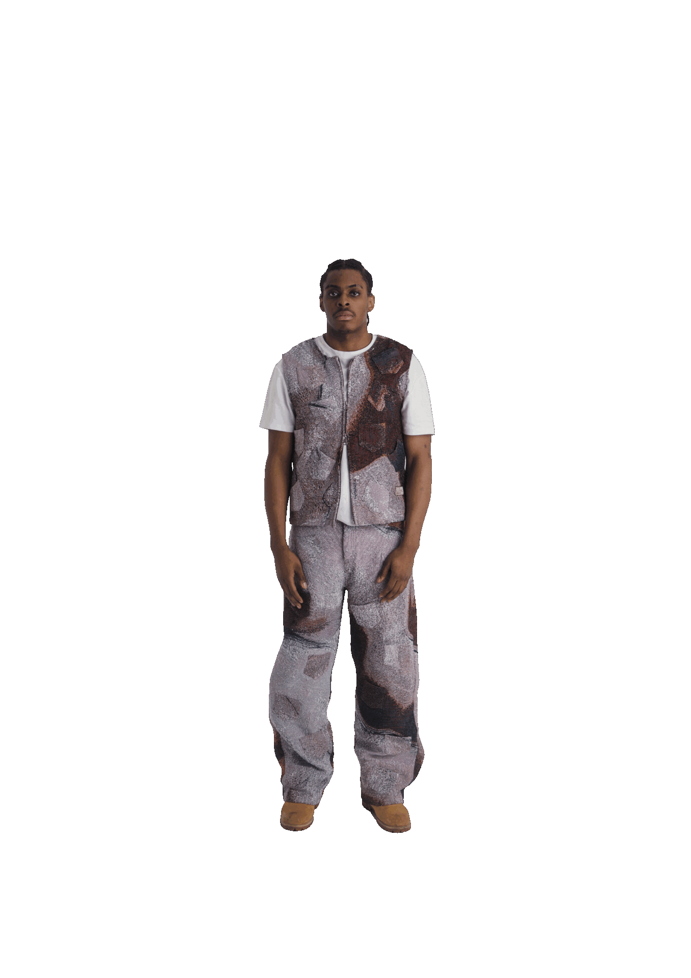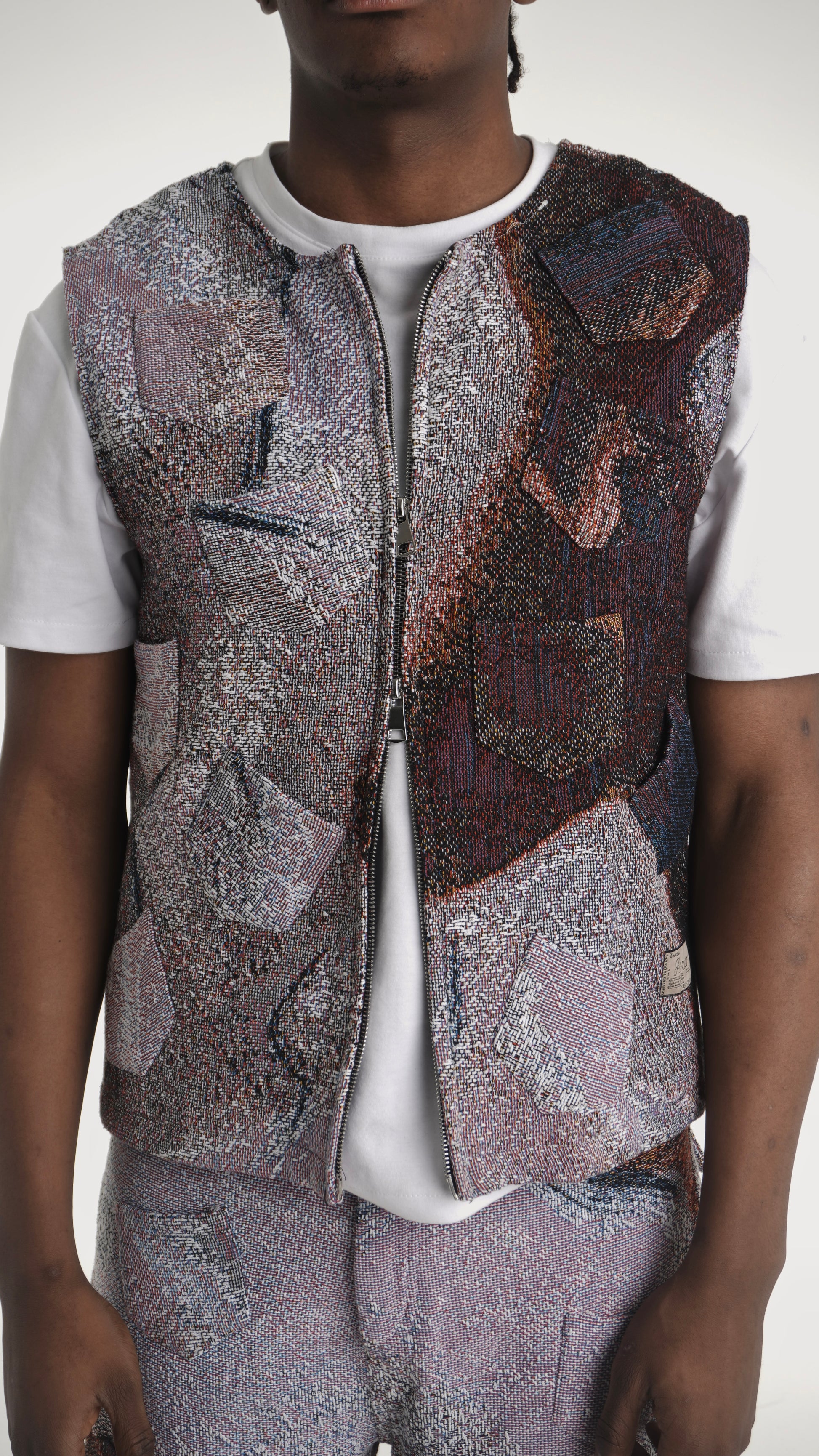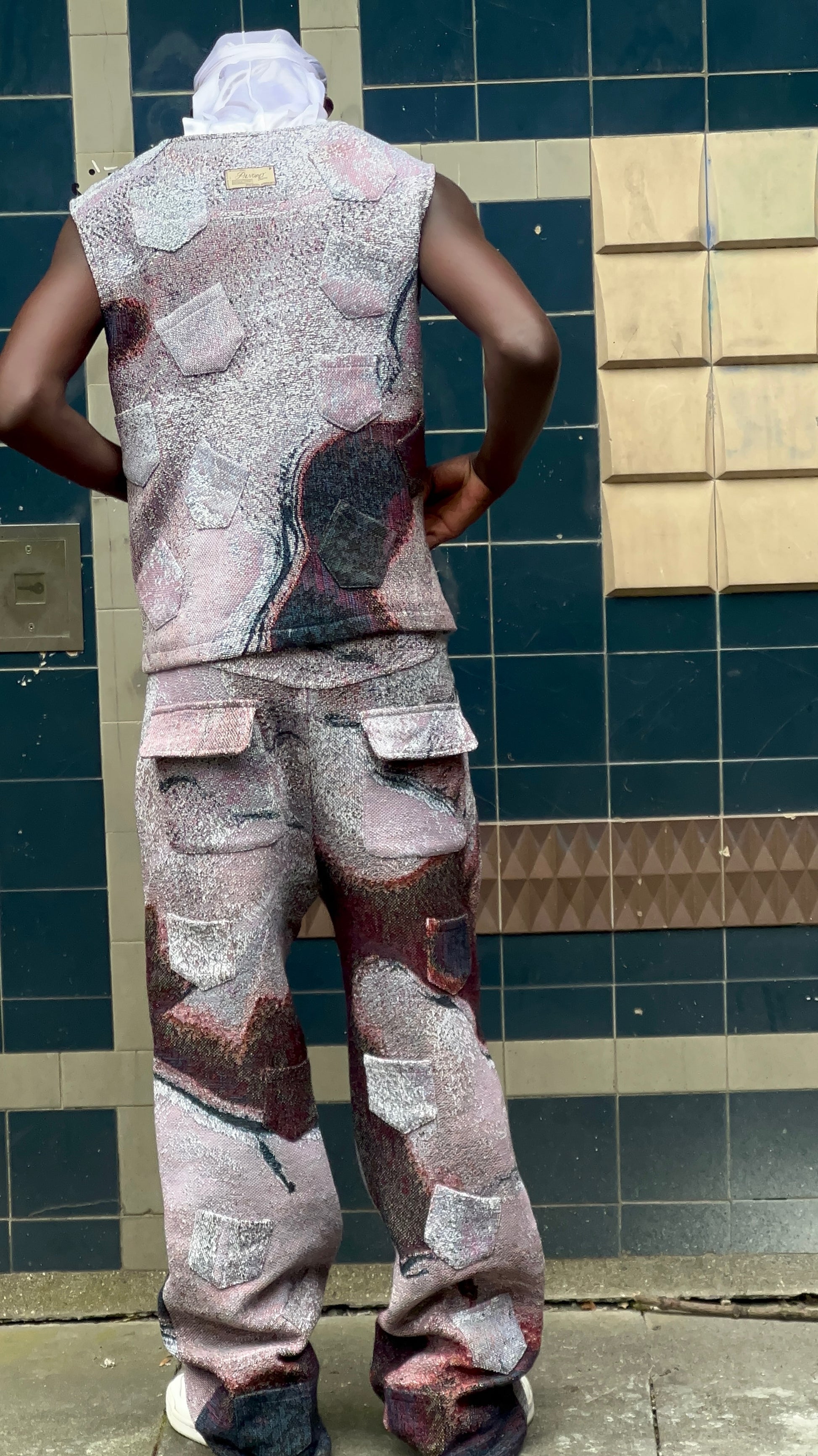 The [ STRACCI ] multi pocket set is a 1 of 1 piece . The set consist of a box-fitted vest and baggy straight legged trousers . The pieces are crafted in a heavy, tight knitted and high quality tapestry . The vest opens and closes by a zipper, that functions in both opposite ways . The trousers have a straight fit from top to bottom, and goes over the shoe .