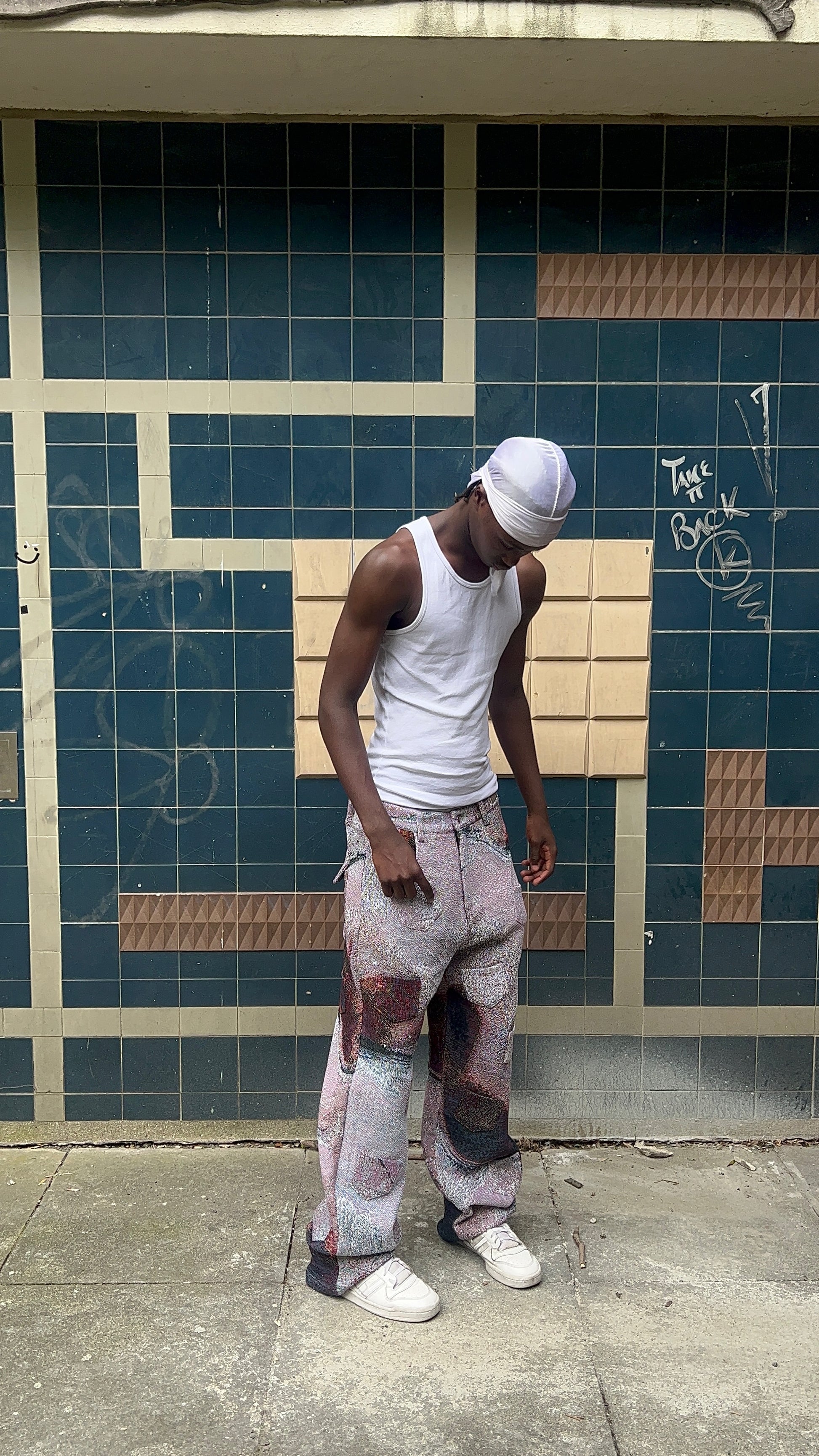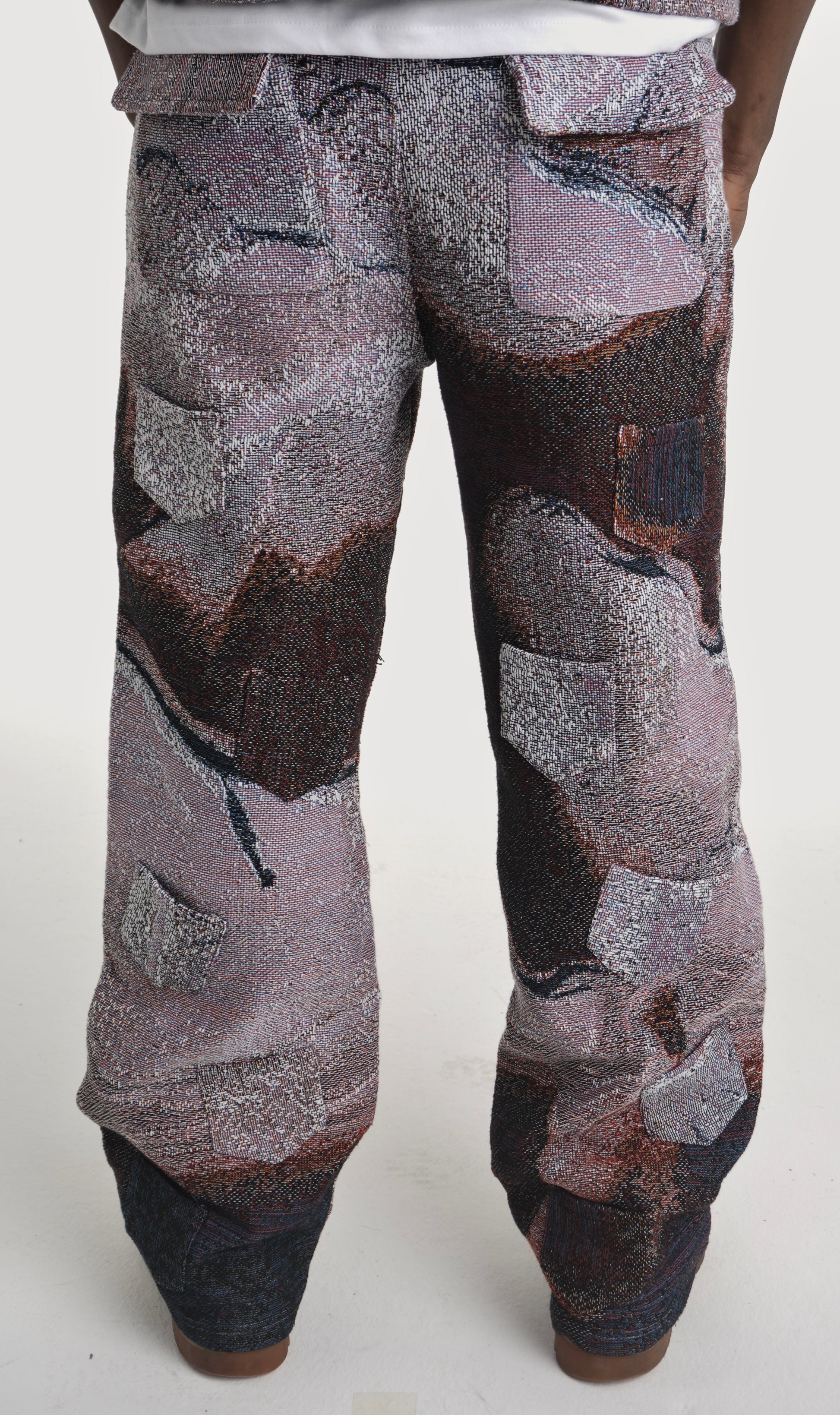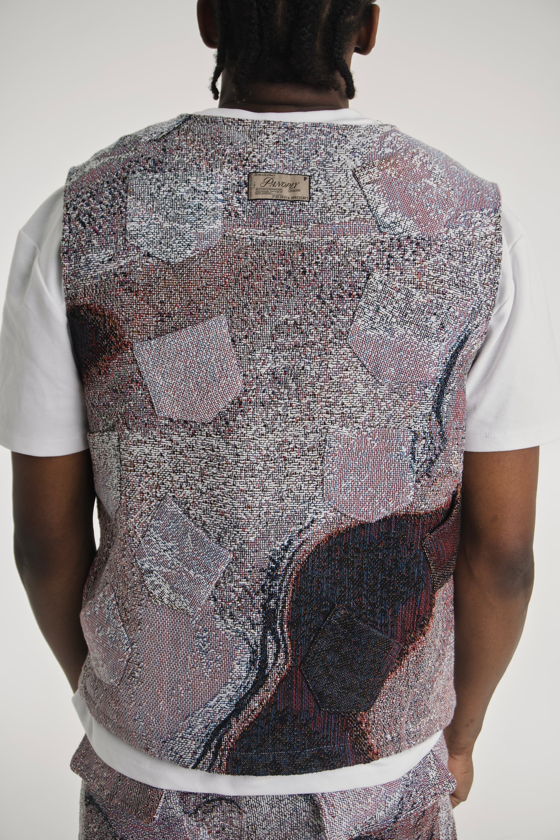 The [ STRACCI ] multi pocket set is a 1 of 1 piece . The set consist of a box-fitted vest and baggy straight legged trousers . The pieces are crafted in a heavy, tight knitted and high quality tapestry . The vest opens and closes by a zipper, that functions in both opposite ways . The trousers have a straight fit from top to bottom, and goes over the shoe .